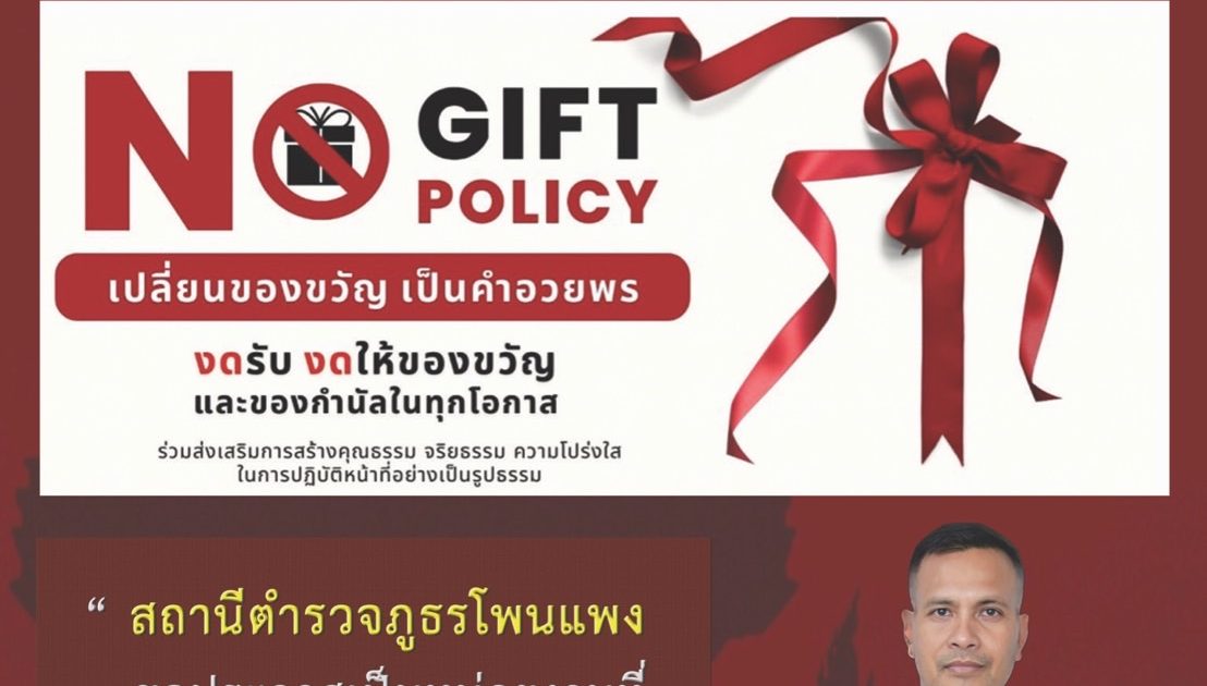“ สถานีตำรวจภูธรโพนแพง ขอประกาศเป็นหน่วยงานที่ เจ้าหน้าที่ทุกคนในสังกัดไม่ รับของขวัญ หรือของกำนัล จากการปฏิบัติหน้าที่ ”